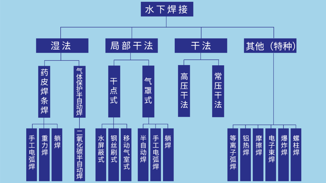 水下焊接如何分類,目前還沒(méi)有統(tǒng)一的規(guī)定。一般都從水下焊接所處的特殊環(huán)境,將水下焊接大體分為三類:濕法水下焊接、干法水下焊接和局部干法水下焊接。但隨著水下焊接技術(shù)的發(fā)展,又出現(xiàn)了一些新的水下焊接方法,如水下螺柱焊、水下爆炸焊、水下電子束焊和水下鋁熱焊等。這些焊法還難以確切地歸于哪一類,故暫按下圖分類。