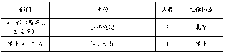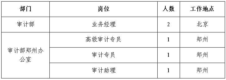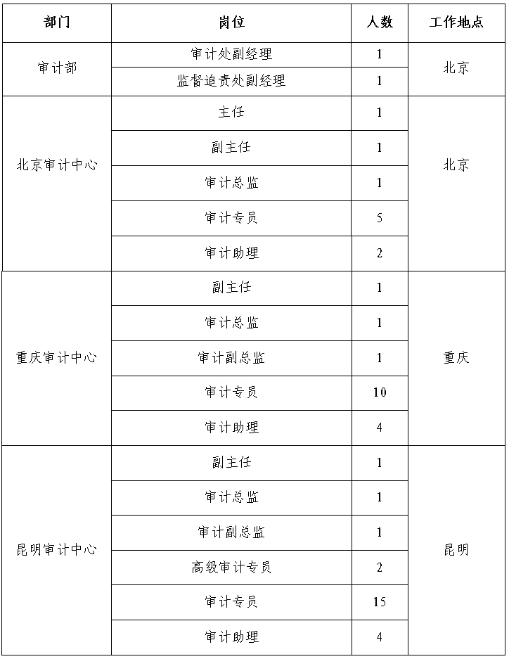 根據(jù)工作需要,經(jīng)研究決定,現(xiàn)面向社會(huì)公開(kāi)招聘方式補(bǔ)充集團(tuán)總部、有關(guān)單位審計(jì)人員65人,F(xiàn)將有關(guān)事項(xiàng)公告如下: