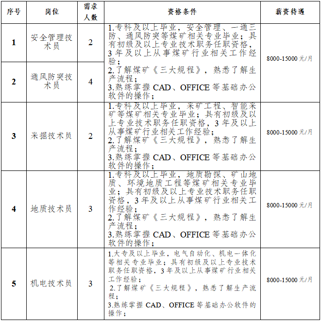 原則上年齡一般不超45周歲,特殊崗位技術(shù)人才可適當(dāng)放寬年齡至50周歲以內(nèi),但需個(gè)人確保到齡退休時(shí),養(yǎng)老保險(xiǎn)繳費(fèi)年限符合退休條件;持有井下相關(guān)操作技能等證書(shū)優(yōu)先考慮;身體健康,無(wú)相關(guān)職業(yè)禁忌癥。