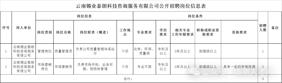 詳見(jiàn)《云南錫業(yè)泰朗科技咨詢(xún)服務(wù)有限公司公開(kāi)招聘崗位信息表》(附件1)。