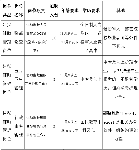 本次擬招聘警務(wù)輔助崗位15人,詳見(jiàn)附表1(云南省楊林監(jiān)獄2021年招聘警務(wù)輔助人員崗位表)。