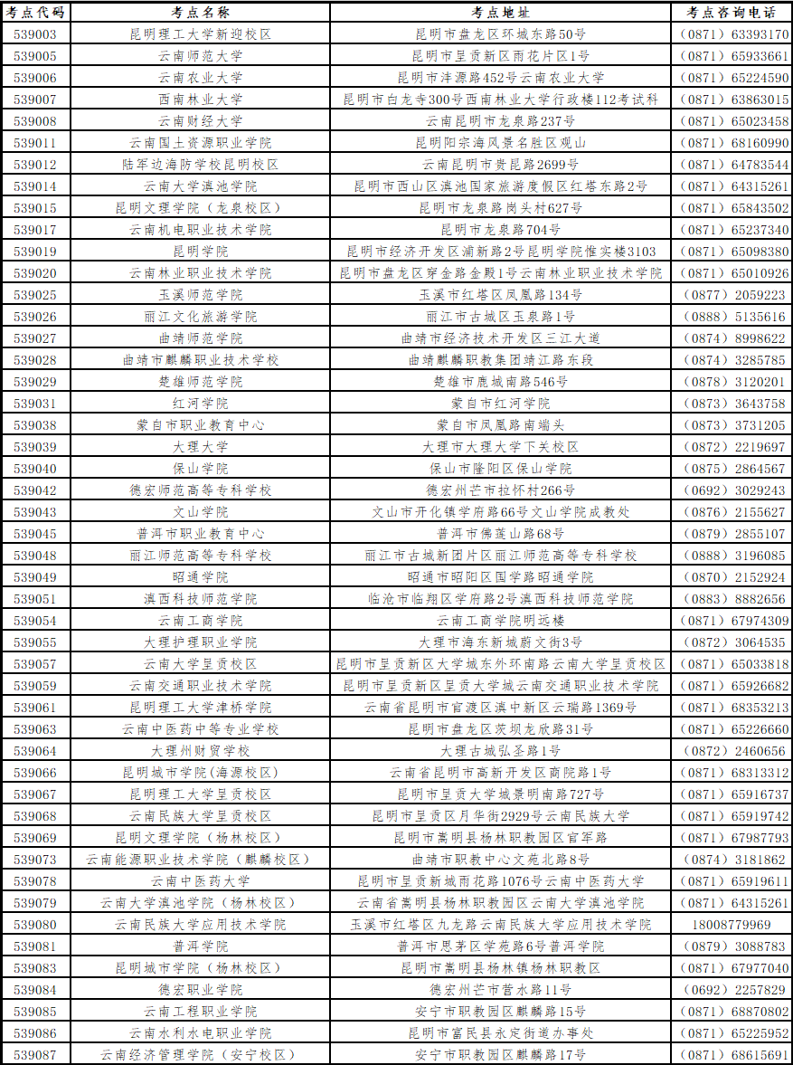 注:本次考試云南中醫(yī)藥中等專業(yè)學(xué)校、云南工程職業(yè)學(xué)院、昆明城市學(xué)院(楊林校區(qū))3個考點接受社會考生報考,其他考點只接受本校在校生報考。