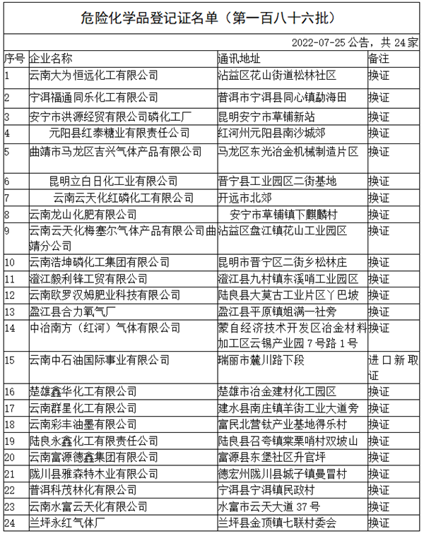 根據《危險化學品安全管理條例》《危險化學品登記管理辦法》有關規(guī)定,經云南省危險化學品登記中心初審、應急管理部化學品登記中心審核合格,下列危險化學品生產、進口單位(共24家)取得《危險化學品登記證》,現予以公告。